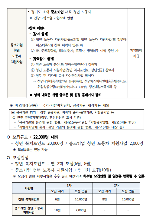 안녕하세요 워트입니다. 경기도는 청년 근로지의 복지향상을 위하여 복지몰 전용 포인트를 지원하고 있습니다.해당 사업은 2025년 6월, 8월 총 2회 모집 예정으로, 정확한 모집 일정과 세부 내용
