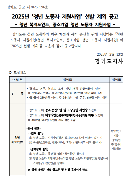 2025 경기 청년 복지포인트 지원사업 - 일정안내, 신청자격, 지원금액, 공고문 확인하기, 개인사업