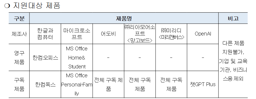 | 지원내용 | 소프트웨어 구입 또는 구독료 실비 지원 (1종) |