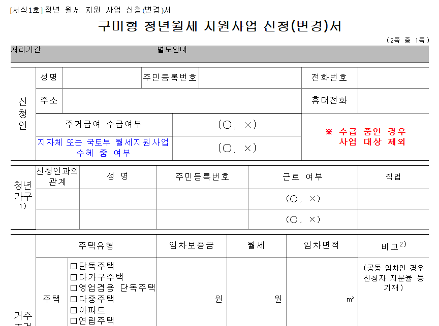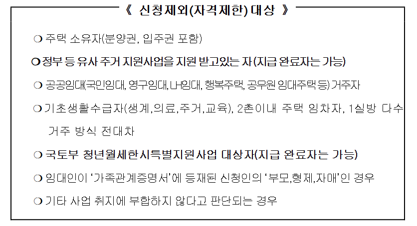 | 주거형태 | 부모와 별도 거주, 보증금 5천만 원 이하 / 월세 60만 원 이하 주택 거주 |
