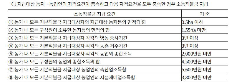 | 제외 대상 | - 농업 외 종합소득 3,700만 원 초과 - 1,000㎡ 미만 경작 농가 - 부정수급 이력자, 농지처분명령자 등 |