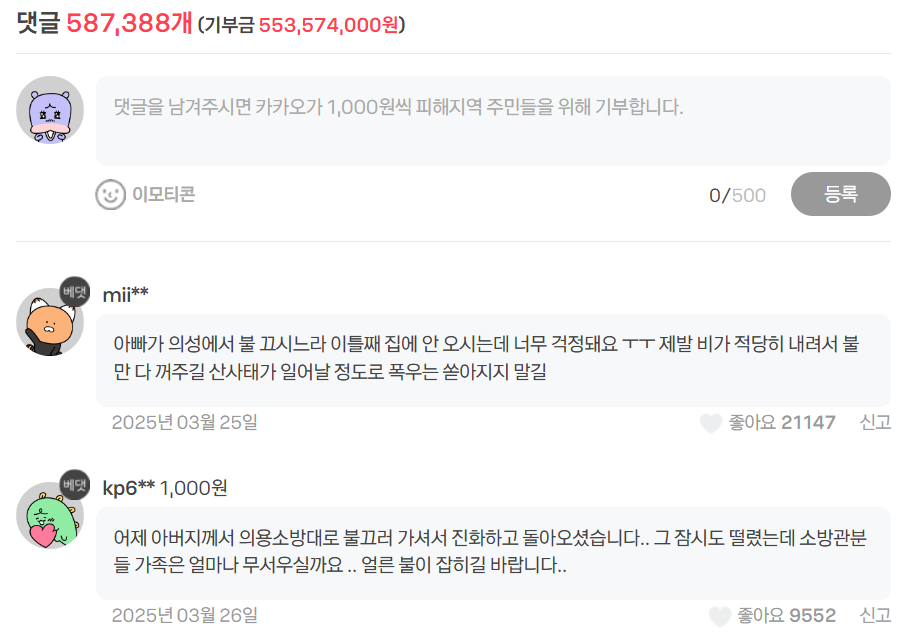 2025년 봄, 강원도와 경상북도 일대를 휩쓴 대형 산불은 수많은 이들의 삶의 터전을 앗아갔습니다. 언론을 통해 폐허가 된 마을과, 당장 생활할 곳조차 없는 이재민들의 이야기가 전해지며 많은 이들이 안타까움을 느끼고 있습니다. 그리고 놀랍게도, 기부를 한 번도 해본 적 없던 일반 시민들 사이에서도 ‘무언가 도움이 되고 싶다’는 마음이 움직이기 시작했고, '첫 기부'가 활발하게 이루어지고 있다는 것을 알게 되었습니다.