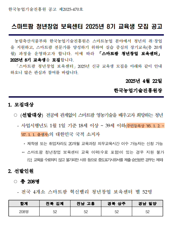 2025.04.21 - [분류 전체보기] - [스마트팜 청년창업 보육센터 8기] 밀양,상주,고흥,김제| 지역별 비교,현장설명회 일정, 모집일정, 공고문 확인하기