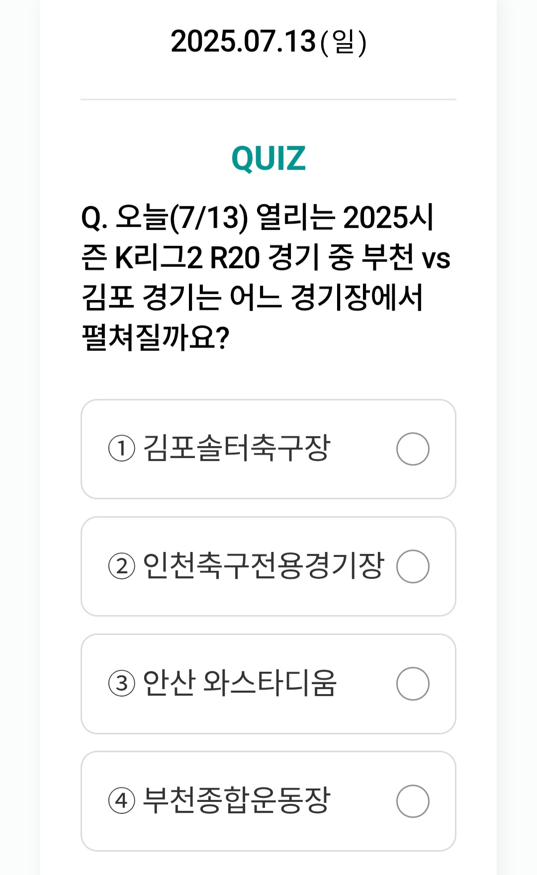 | 하나원큐 축구퀴즈 정답 - 오늘(7/12) 열리는 2025시즌 K리그2 R20 경기 중 전남은 어느 팀과 경기를 펼칠까요? (0) | 2025.07.12 |