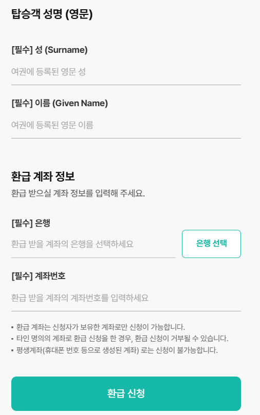 본인확인(핸드폰인증) 후 여권에 등록된 성/이름 및 환급계좌 입력하면 끝.