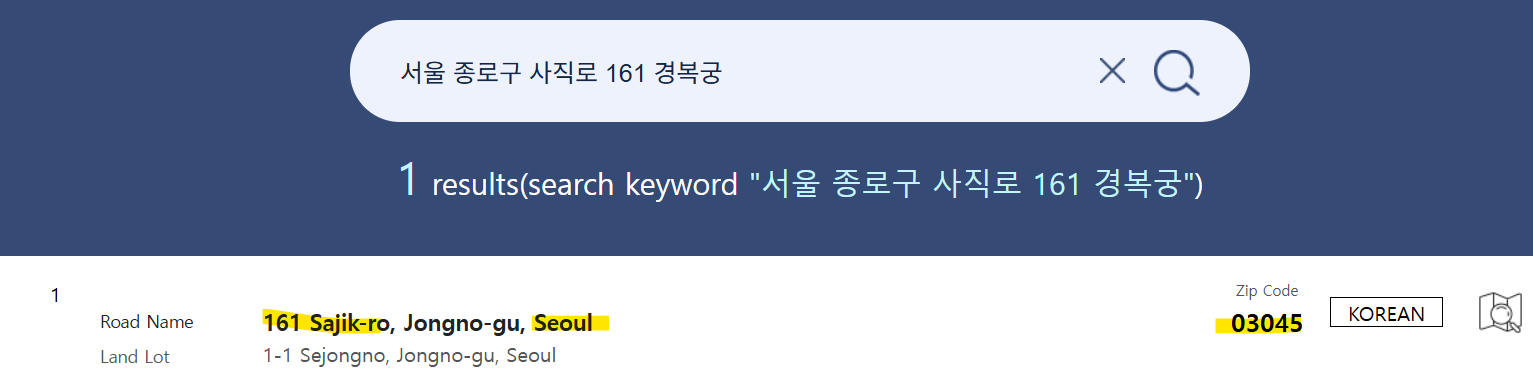 *한국 주소일경우(아래 사진 하이라이트 참고)