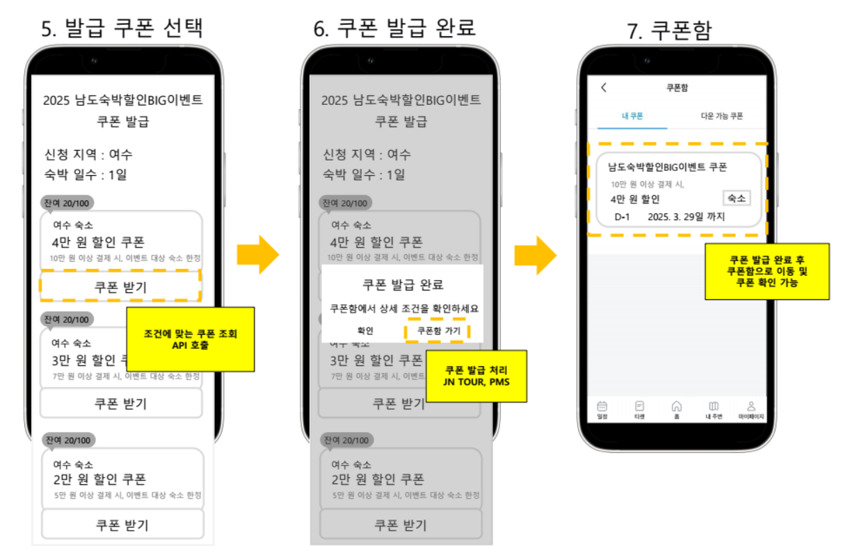 ① 전남관광플랫폼 앱 로그인 → ② 2025 남도 숙박할인 대전 일반신청 → ③ 쿠폰 신청서 작성 → ④ 신청서 최종 확인 후 제출 → ⑤ 발급 쿠폰 선택 → ⑥ 쿠폰 발급 완료