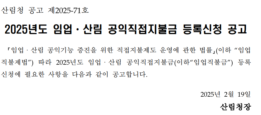 | 2025 임업·산림 공익직접지불금(임업직불금) 신청 안내, 지급 기준과 계산 방식 (0) | 2025.04.09 |