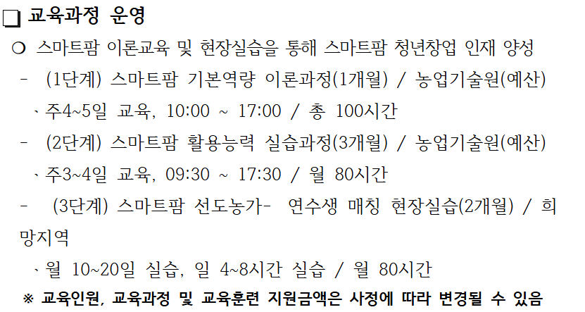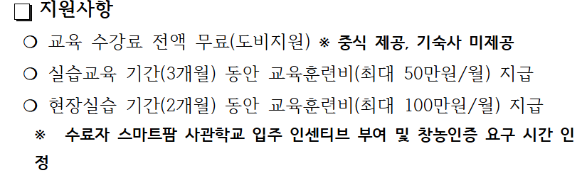 | 지원내용 | - 교육 수강료 전액 무료(도비지원) - 중식 제공, 기숙사 미제공 - 실습교육 기간(3개월) 동안 교육훈련비(최대 50만원/월) 지급 - 현장실습 기간(2개월) 동안 교육훈련비(최대 100만원/월) 지급 ※ 수료자 스마트팜 사관학교 입주 인센티브 부여 및 창농인증 요구 시간 인정 |