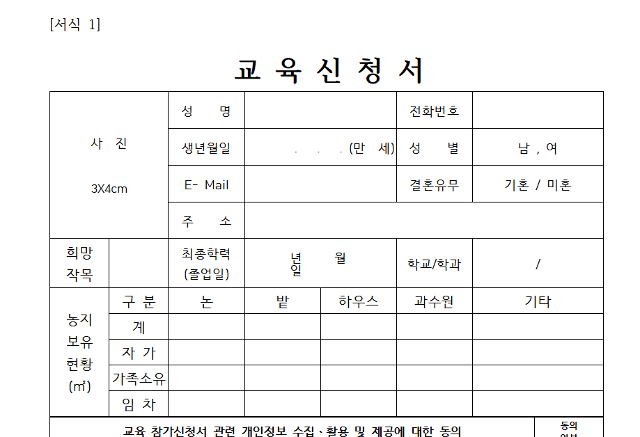 | 도외 (타 지역 거주자) | 온라인 신청( kimng6144@korea.kr) : 충남농업기술원 홈페이지 (공지사항)에서 교육신청서 다운로드 및 작성 이메일 제출 |